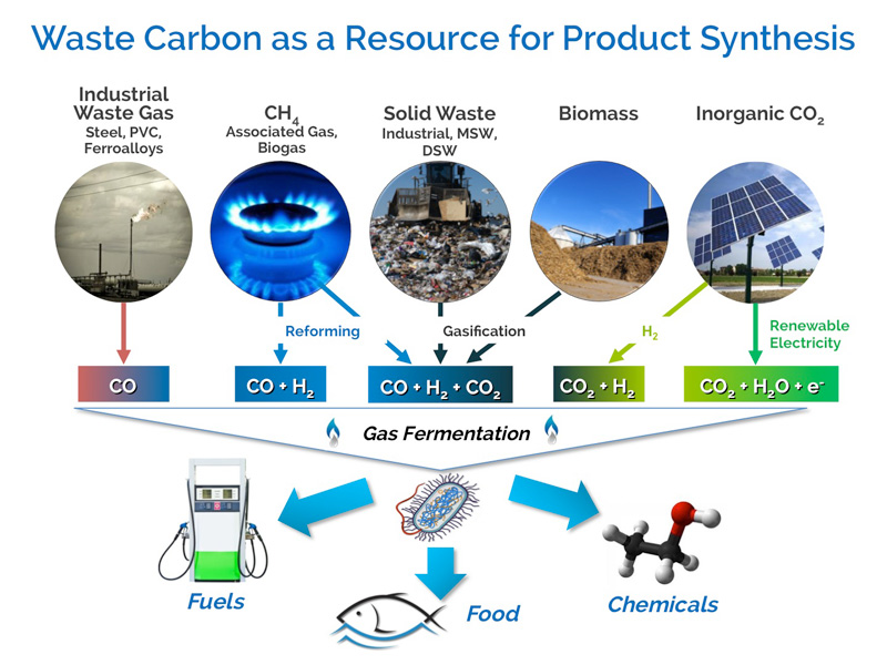 Lanza tech開發(fā)了一種方法可利用CO和H2系列氣體組成的氣體流生產(chǎn)燃料如乙醇和化學(xué)品比如以高選擇性和高得率生產(chǎn)2,3-丁二醇。CO / CO2和H2在使用過(guò)程中,LanzaTech的專有微生物可以只消耗CO,這得益于在微生物內(nèi)部發(fā)生高效率的生物水-氣體轉(zhuǎn)換反應(yīng)。