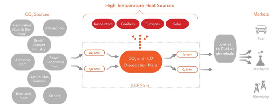 NCF的解決方案就基于以色列教授Jacob Karni和他Weizmann科學(xué)研究所的團(tuán)隊(duì)在實(shí)驗(yàn)室完成了一項(xiàng)技術(shù)的研發(fā),并在實(shí)驗(yàn)室得到了驗(yàn)證。這項(xiàng)技術(shù)包含了一個(gè)全新的利用超高溫來(lái)分解二氧化碳,使其成為一氧化碳和氧氣的方法。同時(shí),相同的方法可以把水分解成氫和氧。一氧化碳或者合成氣能夠被用作氣體燃料(比如說(shuō)在發(fā)電廠),或者被轉(zhuǎn)化成液體燃料(比如甲醇或者其他合成燃料)。在工藝流程中產(chǎn)生的氧氣可以用于清潔燃料的燃燒,例如使用高級(jí)燃燒方法,如在發(fā)電廠里的富氧燃燒。
